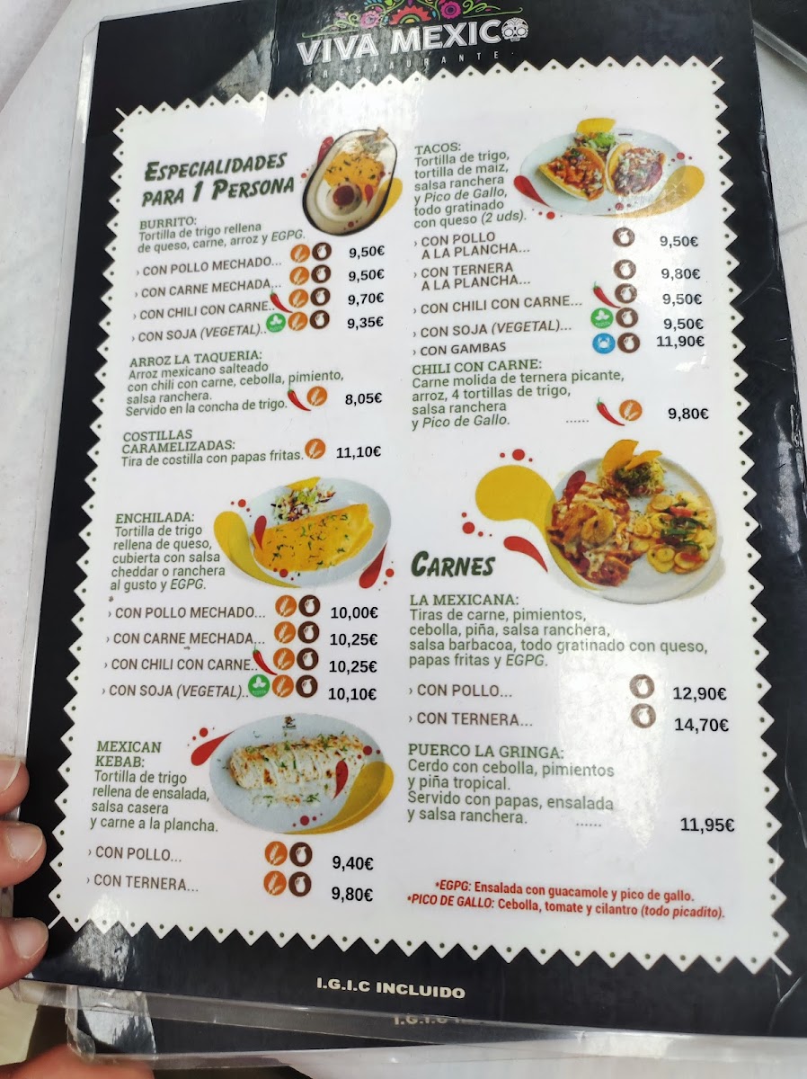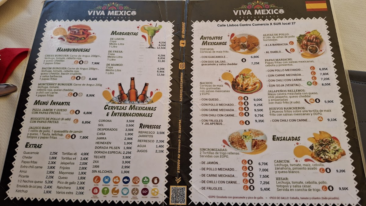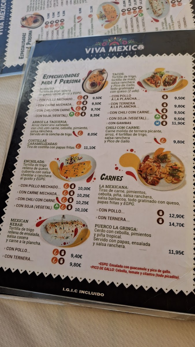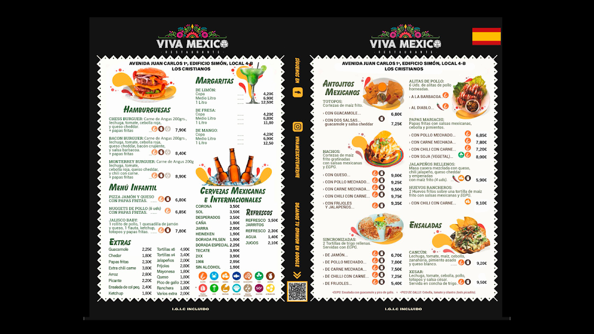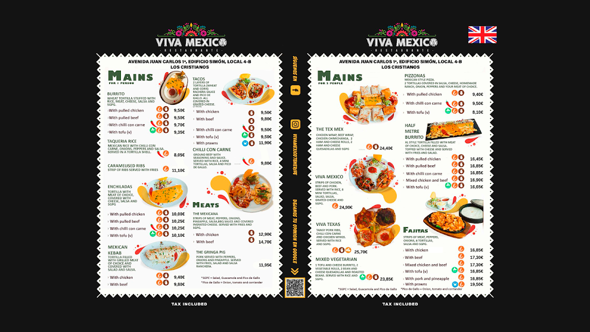 The menu at Viva Mexico in Costa Adeje comes together as a well-balanced showcase of classic Mexican comfort food paired with vibrant drinks, making it easy to see why it appeals to both first-time visitors and returning guests. The selection begins strongly with Nachos, which set the tone as a generous and shareable option, ideal for opening a meal in a relaxed, social setting. Alongside them, Guacamole stands out as a fresh and essential staple, reinforcing the restaurant’s focus on familiar flavors done properly rather than overcomplicated interpretations. On the drinks side, the Margarita de Mango adds a refreshing contrast, offering a fruity twist that complements the spicier and heartier dishes on the menu while enhancing the overall dining experience. Moving into the mains, Tacos Con Pollo represent a dependable and satisfying choice, combining seasoned chicken with classic taco elements that feel both approachable and authentic. For those looking to sample more variety in one plate, Mix Carnes Viva México serves as a highlight of the menu, bringing together different meats and showcasing the kitchen’s strengths in bold seasoning and generous portions. Taken as a whole, the menu feels cohesive and purposeful, focusing on recognizable Mexican favorites that are easy to enjoy, well-suited for sharing, and consistent with the casual, lively atmosphere Viva Mexico aims to deliver.